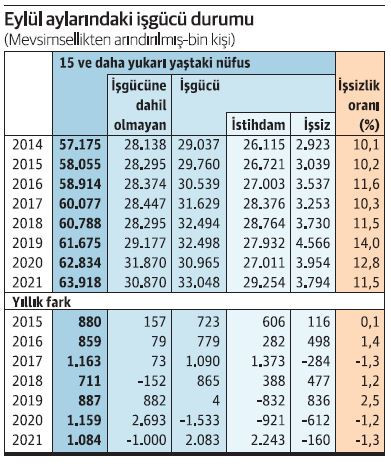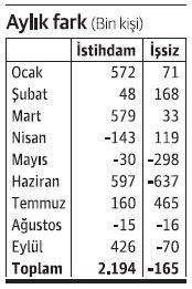 Eylülde işgücü 356 bin kişi arttı; bu kişilerin hepsine iş bulunduğu gibi işgücü artışının üstünde bir istihdam artışı da sağlandı. Eylüldeki istihdam artışı tam 426 bin kişiye ulaştı. İşsiz sayısı düştü, işsizlik oranı da yüzde 11.8’den yüzde 11.5’e geriledi.