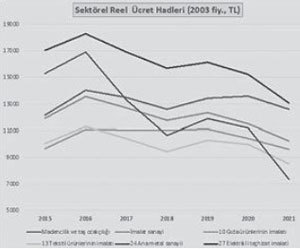 Reel ücretlerin ise sanayinin hemen hemen bütün sektörlerinde ve Türkiye ekonomisi ortalamasında kabaca yüzde 10 ile yüzde 20 arasında geriletilmiş olduğunu gösterdik. Asgari ücretteki yamalara, memur maaşlarındaki ötelenmelere rağmen bu kâr etkili enflasyonun dinamikleri o kadar dirençli, o kadar uzun süreliydi ki ücretlerdeki bu 1-2 aylık iyileştirmeler emekçiye refah artışı sağlamadı, ücret artışı getirmedi. 2021 sonu itibariyle 2015’e göre emeğin milli gelirden aldığı pay yaklaşık 10 puan geriletildi. Reel ücretler yaklaşık yüzde 15 ile yüzde 25 sektörlere göre reel olarak geriletilmiş oldu.