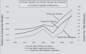 Ana yaklaşımımız Türkçe ’de kâr itkili enflasyon olarak biliniyor. Ücret maliyetlerinden değil ücretlerin bastırılarak kâr oranlarının yükseltildiği yepyeni bir üretici enflasyonu ile karşı karşıya olduğumuzu göstermeye çalıştık. Washington’da emek yanlısı, Ekonomik Politikaları Araştırma Enstitüsü’nün yaptığı araştırmalarda Amerika için örneğin; 1979-2019 dinamiklerinin tersine artık ücretlerin Amerikan enflasyonu içerisindeki sorumluluğunun payı yüzde 8’iken kâr marjlarının payı yüzde 54 olarak belirleniyordu. Biz de Türkiye’de 2015’ten başlayarak 2021 sonuna kadar kâr marjlarının Türkiye genelinde yüzde 14’ten yüzde 22’ye, sanayi sektörleri ortalamasında ise yüzde 11’den yüzde 18’e kabaca 7 puan yükseltildiğini ve bunun da üretici fiyat enflasyonunda özellikle çok belirleyici bir unsur olduğunu gösterdik.