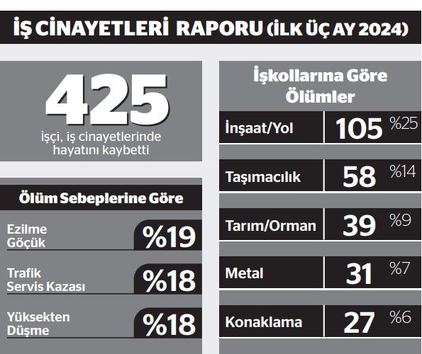 Rapora göre ocak ayında 161, şubat ayında 149 ve mart ayında 115 olmak üzere 2024 yılının ilk üç ayında en az 425 işçi çalışırken yaşamını yitirdi.
