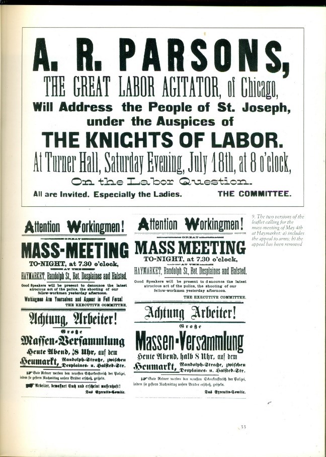 Zanlıların jüri tarafından suçlu bulunmasında savcılıkça kullanılan en önemli belge, 4 Mayıs 1886 gösterileri için anarşistlerce yayınlanan mitinge çağrı ilanıydı. Mitinge çağrı metninin ilk biçiminde, “işçiler, silahlanın ve tüm gücünüzle gelin” sözleri yer alıyordu. August Spies, provokasyon korkusuyla, bu cümleye karşı çıktı ve bu bölümün metinden çıkarılmasını sağladı. Ancak bu arada bir başka matbaada bu bildiri 25 bin adet basılmıştı. Bu bildirilerin hemen hemen tümü imha edildi. Ancak birkaç yüz bildiriye ulaşılamadı. Gazetede yayınlanan miting çağrısında ise bu cümle yer almıyordu. (IUF, May Day, The Origins, 1985, s.9)