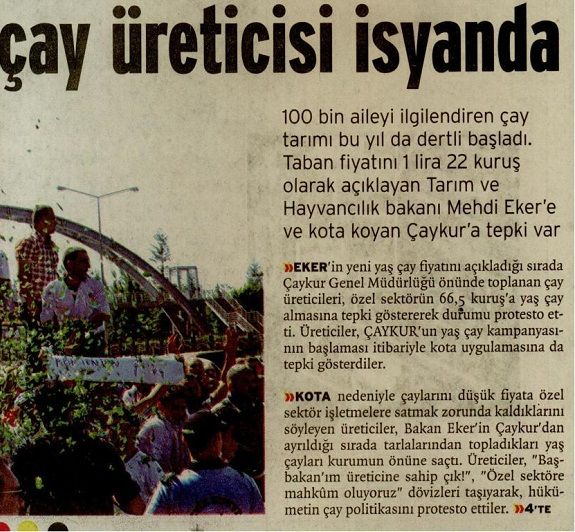 KOTA nedeniyle çaylarını düşük fiyata özel sektör işletmelere satmak zorunda kaldıklarını söyleyen üreticiler, Bakan Eker’in Çaykur’dan ayrıldığı sırada tarlalarından topladıkları yaş çayları kurumun önüne saçtı. Üreticiler, "Başbakan’ım üreticine sahip çık!", "Özel sektöre mahkûm oluyoruz" dövizleri taşıyarak, hükümetin çay politikasını protesto ettiler.