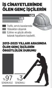 19 Mayıs Gençlik ve Spor Bayramı’nda İşçi Sağlığı ve İş Güvenliği (İSİG) Meclisi, ‘2013-2025 Genç İşçiler İş Cinayetleri Raporu’nu açıkladı. 2013 ile 2025’in ilk dört ayı arasını kapsayan rapora göre en az 2728 genç işçi, alınmayan önlemler ve ihmal sonucu çalışırken hayatını kaybetti.