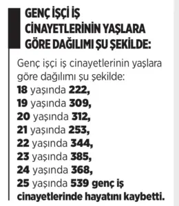 Rapora göre her ay ortalama 18-19 genç işçi iş cinayetlerinde hayatını kaybediyor. Hayatını kaybeden genç işçilerin yüzde 24’ü trafik ve servis kazalarında, yüzde 16’sı yüksekten düşerek, yüzde 15’i ise ezilme ve göçük altında kalarak hayatlarını kaybetti. Hayatını kaybeden genç işçilerin 2 bin 493’ü erkek, 235’i ise kadın olarak kayıtlara geçti. Rapora göre iş cinayetlerinde hayatını kaybeden genç işçilerin 284’ü göçmen işçilerdi. İş kollarına göre ölüm oranlarına da yer veren İSİG’in raporuna göre, hayatını kaybeden genç işçilerin yüzde 26’sı yani 718 genç inşaat ve yol, yüzde 16’sı 445 genç tarım ve orman, yüzde 9’u 241 genç konaklama, yüzde 7’si taşımacılık 180 genç ve yüzde 6’sı 164 genç de metal sektöründe çalışıyordu. Hayatını kaybeden gençlerin 222’si 18, 1214 genç, 19-22, 1292 genç ise 23-25 yaş aralığındaydı.
