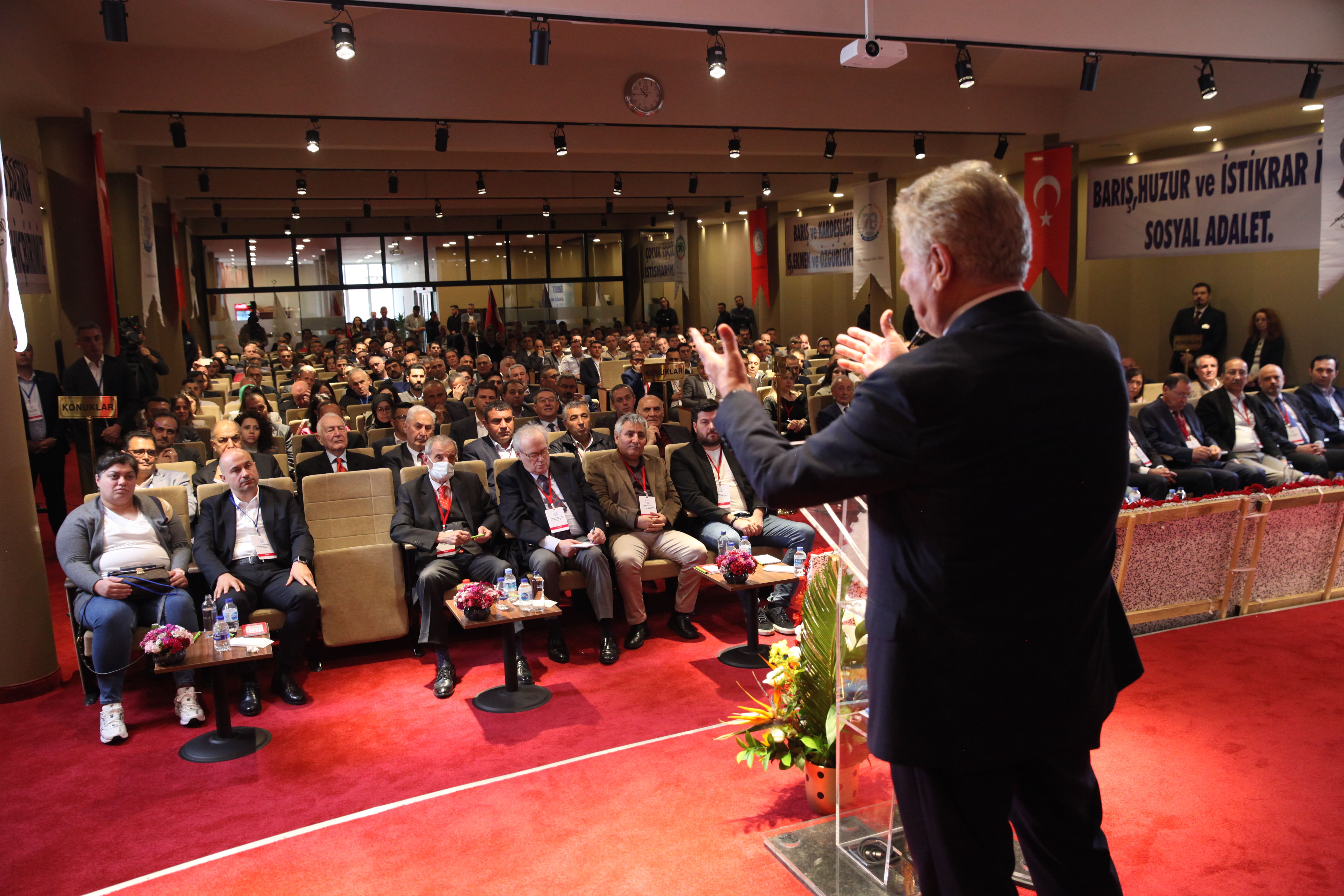 Genel Başkanımız Mustafa Türkel, açılış konuşmasında ülkemizin ve dünyanın içinden geçtiği zorlu süreci özetlediği konuşmasında, çalışma hayatına yansımalarına değindi. Pandemiyle başlayan ve arkasından gelen ekonomik kriz sürecinin çalışanların ekmeğini büyük boyutta küçülttüğünü söyledi. Sendika olarak ekonomik krizin etkilerinden üyeleri mümkün olduğunca korumak için işverenlere o süreçte mektup yazdığını ifade eden Genel Başkanımız, işverenlerin bir ikisinin dışında olumlu dönüş yaptığını belirtti. Ancak ülkemizdeki ekonomik krizin hala sürdüğünü ve önümüzdeki sürecin de bu anlamda zor geçeceğini ifade ederek, herkesin genel seçimlerde şapkasını önüne koyması gerektiğini söyledi. Konuşmasında gelir vergisine de değinen Genel Başkanımız, konuşmasına şöyle devam etti: “Bu ülkede öncelikle gelir dağılımındaki adaletsizliğin giderilmesi gerekiyor. Herkes geliri oranında vergi vermeli. Biz sendika olarak adil bir vergi sisteminin gerçekleştirilebilmesi için çabalıyoruz ve bu konuda konfederasyonumuz TÜRK-İŞ’e de zaman zaman çağrılarımız oldu. Toplu İş Sözleşmelerimizde vergi muafiyetiyle ilgili ilave düzenlemeler yaptık. Ancak bugüne kadar bu konuyu başaramadık. İnanıyorum ki, biz bu vergi düzenlemelerinde ısrarcı olursak, önümüzdeki günlerde bu konuda da mesafe alabiliriz. Türkiye’de çalışanların vergi yükünün hafifletilmesi için sendikal hareketin olağanüstü bir çaba göstermesi gerekiyor.”