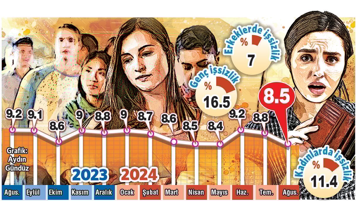 Ekonomide uygulanan sıkı para politikaları üretim ve istihdam üzerindeki negatif etkisini artırdı. Başta sanayi olmak üzere pek çok sektör ağustos itibarıyla yavaşlama sinyalleri verirken, işsizlik ise dar kapsamlı verilerde azaldı, gerçek işsizlik ise pandemi sonrası en yüksek seviyelerden birine ulaştı. Türkiye İstatistik Kurumu (TÜİK) verilerine göre, işsiz sayısı 2024 yılı Ağustos ayında bir önceki aya göre 89 bin kişi azalarak 3 milyon 55 bin kişi oldu. İşsizlik oranı ise 0.3 puan azalarak yüzde 8.5 seviyesinde gerçekleşti.