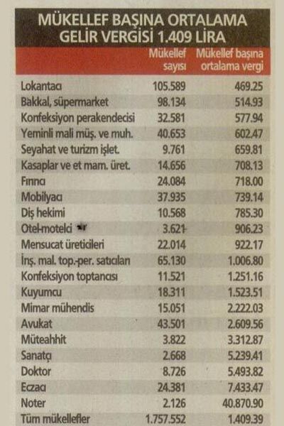 MALİye’ye en çok yardımcı olması gereken mali müşavir ve muhasebecilerin ödediği vergi 602 lirada kaldı. Geçen yılki kazançları üzerinden en yüksek gelir vergisini, tüm kazançları kayıt altında olan noterler ödedi. Noter başına ödenen yıllık vergi 40 bin 870 lira olurken, onları 7 bin 433 lirayla eczacı izledi. Yıllık vergi doktorlarda 5 bin 493 lira, sanatçılarda ise 5 bin 239 lira oldu.