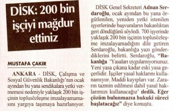 DİSK Genel SEKRETERİ Adnan Serdaroğlu, ocak ayından bu yana örgütlenilen, yeniden yetki istenilen işyerlerinde başvuralann bakanlıktan geri döndüğünü söyledi. 700 işyerinde yaklaşık 200 bin işçinin toplusözleşme imzalayamadığını dile getiren Serdaroğlu, bakanlığa yazı gönderdiklerini belirtti.