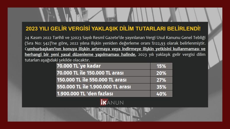 24 Kasım 2022 Tarihli ve 32023 Sayılı Resmî Gazete ’de yayınlanan Vergi Usul Kanunu Genel Tebliği (Sıra No: 542)’ne göre, 2022 yılına ilişkin yeniden değerleme oranı %122,93 olarak belirlenmiştir. Cumhurbaşkanı’nın konuya ilişkin artırmaya veya indirmeye ilişkin yetkisini kullanmaması ve herhangi bir yeni yasal düzenleme yapılmaması halinde, 2023 yılı yaklaşık gelir vergisi dilim tutarları aşağıdaki şekilde olacaktır.