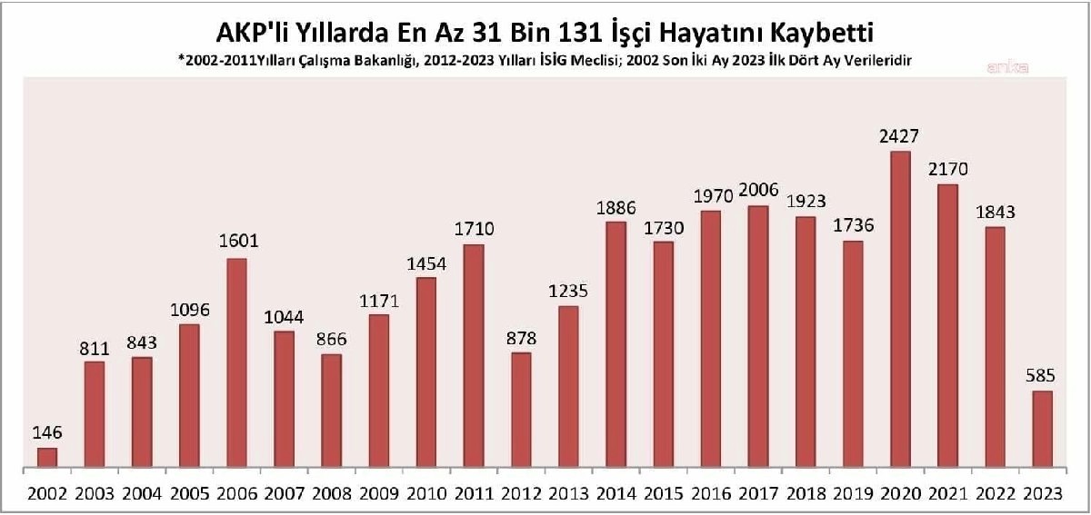 “2002 yılının son iki ayında 146 işçi, 2003 yılında 811 işçi, 2004 yılında 843 işçi, 2005 yılında 1096 işçi, 2006 yılında 1601 işçi, 2007 yılında 1044 işçi, 2008 yılında 866 işçi, 2009 yılında 1171 işçi, 2010 yılında 1454 işçi, 2011 yılında 1710 işçi, 2012 yılında 878 işçi, 2013 yılında 1235 işçi, 2014 yılında 1886 işçi, 2015 yılında 1730 işçi, 2016 yılında 1970 işçi, 2017 yılında 2006 işçi, 2018 yılında 1923 işçi, 2019 yılında 1736 işçi, 2020 yılında 2427 işçi, 2021 yılında 2170 işçi, 2022 yılında 1843 işçi ve 2023 yılının ilk dört ayında 585 işçi iş cinayetlerinde hayatını kaybetti.”