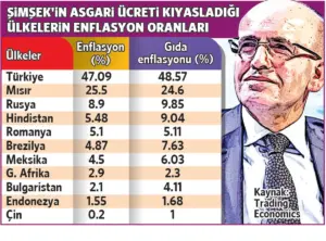 Şimşek, asgari ücret seviyemizin Romanya, Bulgaristan, Meksika, Çin, Brezilya, Güney Afrika, Endonezya, Rusya, Mısır ve Hindistan gibi gelişmekte olan ülkelere göre daha yüksek olduğunu söyledi ancak bu ülkelerin enflasyon oranlarını es geçti.