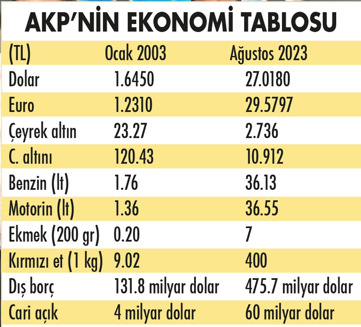 AKP’nin iktidara geldiği 2002 Kasım’dan bugüne Türkiye’nin cari açığı 15 katına çıktı, dış borç yüzde 260.9 arttı. Dolar, Euro tarihi zirveleri görürken üst üste gelen benzin, motorin zamlarıyla otomobili olan evin önüne park etmek zorunda kaldı. Altın fiyatları rekor kırarken, gıda fiyatlarındaki durdurulamayan artışlarla ekmek ve kırmızı et fiyatları da katlandı. Son dönemde gelen vergi zamlarıyla da hanelerin geliri, temel giderleri bile karşılamaya yetmez hale geldi. AKP’nin 21 yıldır izlediği ekonomi politikalarıyla vatandaş yoksulluğa mahkum oldu.