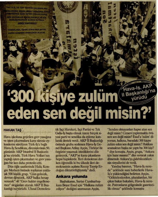 Türk Hava Yolları’nın yaptığı işten çıkarmaları ve grev yasağını bir kez daha protesto etti. Dün öğle saatlerinde Haliç Kongre Merkezi önünde toplanan yaklaşık 500 kişilik grup, "Gün gelecek, devran dönecek, AKP halka hesap verecek" ve "Grev haktır engellenemez" sloganları atarak AKP İl Başkanlığı’na yürüdü.
