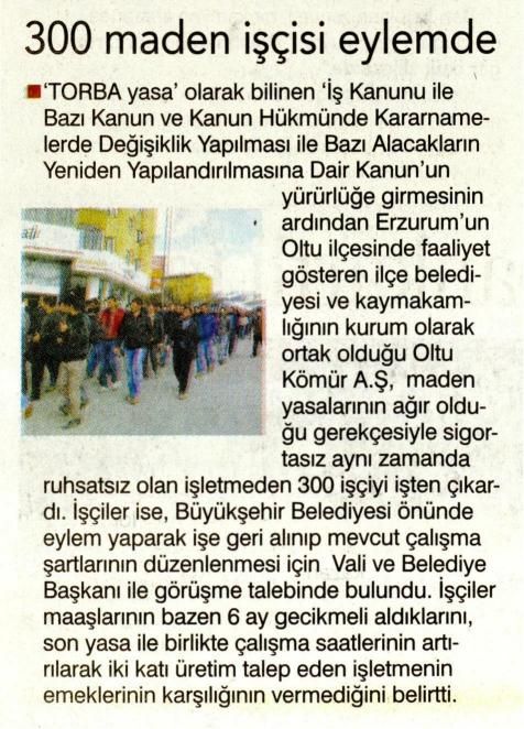 TORBA yasa olarak bilinen ‘İş Kanunu ile Bazı Kanun ve Kanun Hükmünde Kararnamelerde Değişiklik Yapılması ile Bazı Alacakların Yeniden Yapılandırılmasına Dair Kanun’un yürürlüğe girmesinin ardından Erzurum’un Oltu ilçesinde faaliyet gösteren ilçe belediyesi ve kaymakamlığının kurum olarak ortak olduğu Oltu Kömür A.Ş, maden yasalarının ağır olduğu gerekçesiyle sigortasız aynı zamanda ruhsatsız olan işletmeden 300 işçiyi işten çıkardı.