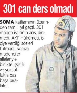 SOMA katliamının üzerinden tam 1 yıl geçti. 301 maden işçisinin acısı dinmedi. AKP Hükümeti, işçiye verdiği sözleri tutmadı. Somali madenciler aileleriyle birlikte işsizlik ve yoksullukla baş başa bırakıldı. 301 can ders olmadı.