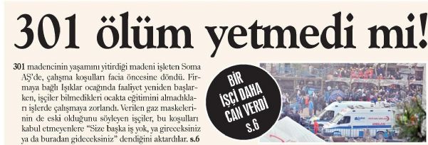 301 madencinin yaşamını yitirdiği madeni işleten Soma AŞ´de, çalışma koşulları facia öncesine döndü. Firmaya bağlı Işıklar ocağında faaliyet yeniden başlarken, işçiler bilmedikleri ocakta eğitimini almadıkları işlerde çalışmaya zorlandı. Verilen gaz maskelerinin de eski olduğunu söyleyen işçiler, bu koşulları kabul etmeyenlere Size başka iş yok, ya gireceksiniz ya da buradan gideceksiniz dendiğini aktardılar.