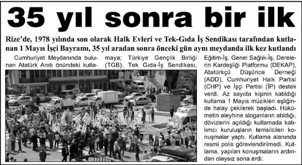 35 yıl sonra bir ilk Rize´de, 1978 yılında son olarak Halk Evleri ve Tek-Gıda İş Sendikası tarafından kutlanan 1 Mayıs İşçi Bayramı, 35 yıl aradan sonra önceki gün aynı meydanda ilk kez kutlandı.