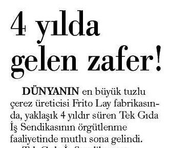 DÜNYANIN en büyük tuzlu çerez üreticisi Frito Lay fabrikasında, yaklaşık 4 yıldır süren Tekgıda İş Sendikasının örgütlenme faaliyetinde mutlu sona gelindi.