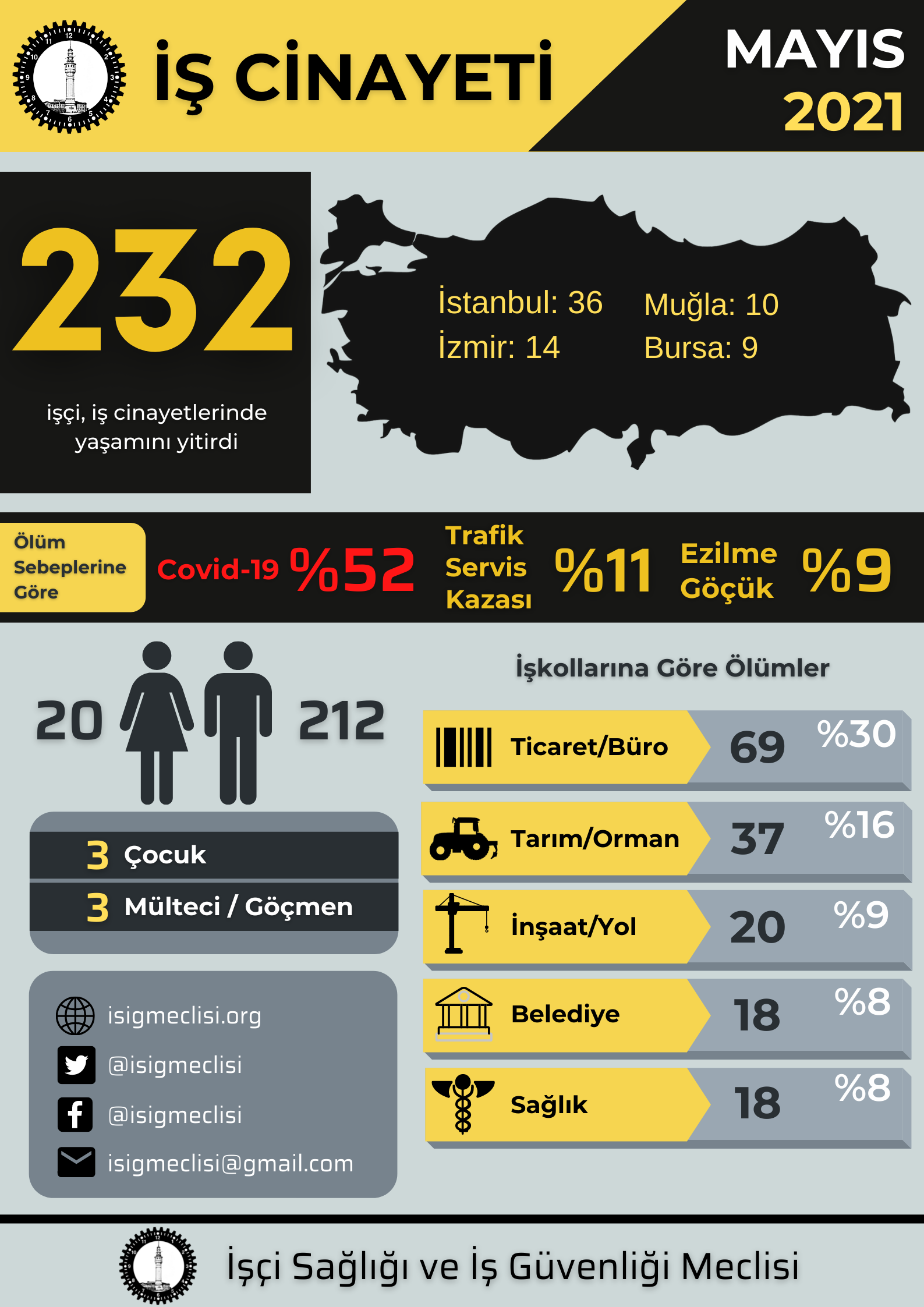 İşçi Sağlığı ve İş Güvenliği (İSİG) Meclisi mayıs ayı ölümlü iş kazaları raporunu yayımladı. Yüzde 60’ının ulusal basından; yüzde 40’ının yerel basın, işçilerin mesai arkadaşları, aileleri, iş güvenliği uzmanları, işyeri hekimleri, meslek örgütleri ve sendikalardan edinilen bilgilere göre hazırlanan rapora göre geçen ay en az 232 işçi çalışırken yaşamını yitirdi. Ocak ayında en az 203 işçi, şubatta en az 141 işçi, martta en az 144 işçi, nisanda en az 252 işçi, mayısta en az 232 işçinin hayatını kaybetmesiyle 2021 yılının ilk beş ayında iş kazalarında en az 972 işçi öldü.