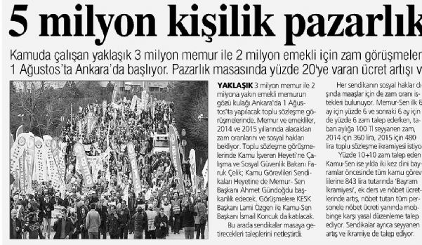 Pazarlık masasında yüzde 20’ye varan ücret artışı yaklaşık 3 milyon memur ile 2 milyona yakın emekli memurun gözü kulağı Ankara’da 1 Ağustos’ta yapılacak toplu sözleşme görüşmelerinde. Memur ve emekliler, 2014 ve 2015 yıllarında alacakları zam oranlarını ve sosyal hakları bekliyor. Toplu sözleşme görüşmelerinde Kamu işveren Heyeti’ne Çalışma ve Sosyal Güvenlik Bakanı Faruk Çelik; Kamu Görevlileri Sendikaları Heyetine de Memur- Sen Başkanı Ahmet Gündoğdu başkanlık edecek.