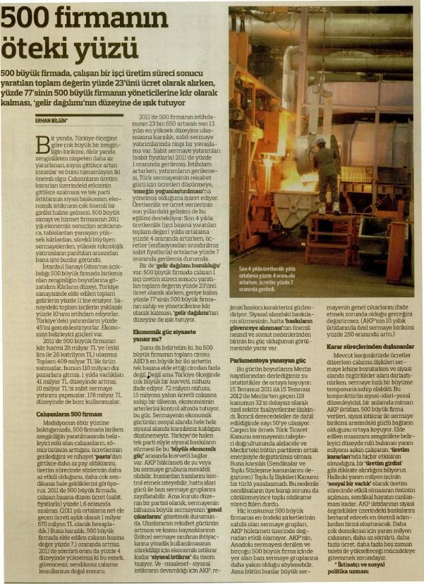 Bir yanda, Türkiye ölçeğine göre çok büyük bir zenginliğin birikimi, öbür yanda zenginlikten nispeten daha az yararlanan, sayısı gittikçe artan insanlar ve bunu tamamlayan iki önemli olgu: Çalışanların üretim kararları üzerindeki etkisinin gittikçe azalması ve tek parti iktidarının siyasi baskısının, ekonomik istikrarın çok önemli bir girdisi haline gelmesi, 500 büyük sanayi ve hizmet firmasının 2011 yılı ekonomik sonuçları açıklanınca, tablolardan yansıyan yüksek kârlardan, sürekli büyüyen sermayelerden, yüksek teknolojik yatırımların parıltıları arasından bana işte bunlar göründü.