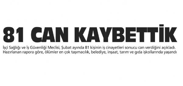 Yazılı, görsel ve dijital basından edinilen bilgiye dayanarak hazırlanan rapora göre, Şubat aymda iş kazalan sonucu en az 81 işçi yaşamını yitirdi.