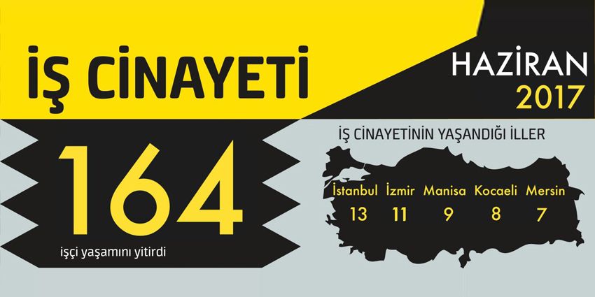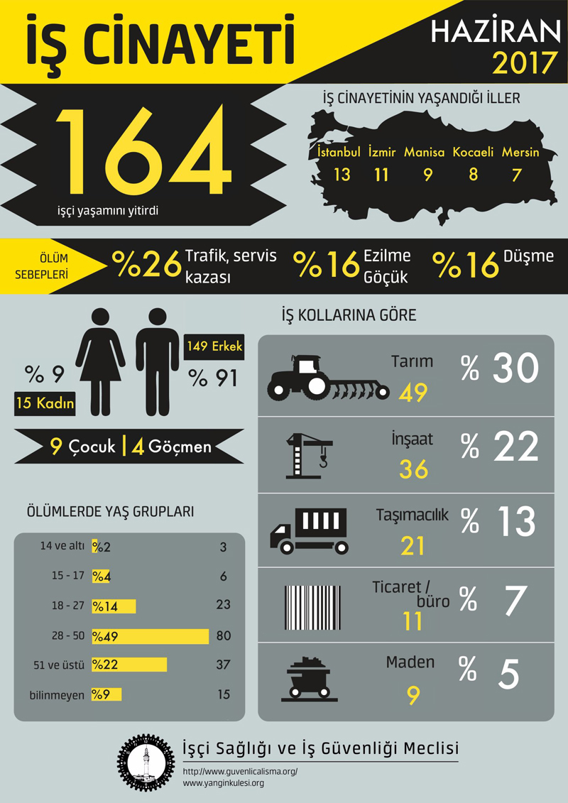 Raporun iş kazalarından ölümlerle ilgili bölümünde Haziran ayında yaşamını yitiren 164 emekçinin 123’ünün işçi, memur statüsünde çalışan ücretlilerden; 29’unun çiftçilerden/küçük toprak sahiplerinden ve 12’si esnaflardan olmak üzere 41’inin kendi nam ve hesabına çalışanlardan oluştuğu vurgulandı.