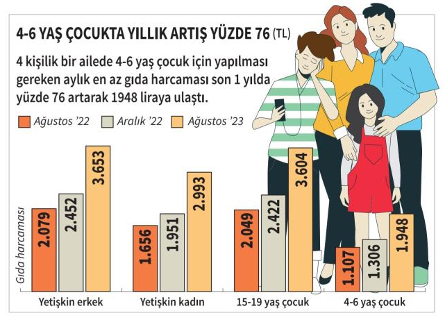 Türk-İş Araştırmasının 2023 Ağustos ayı sonucuna göre dört kişilik bir ailenin sağlıklı, dengeli ve yeterli beslenebilmesi için yapması gereken aylık gıda harcaması tutarı (açlık sınırı), Ağustos 2022’ye kıyasla yüzde 77 artarak 12 bin 198 TL, gıda harcaması ile giyim, konut (kira, elektrik, su, yakıt), ulaşım, eğitim, sağlık ve benzeri ihtiyaçlar için yapılması zorunlu diğer aylık harcamalarının toplamı ise (yoksulluk sınırı) yine yüzde 77 artarak 39 bin 733 TL oldu. Bekâr bir çalışanın “yaşama maliyeti” de yıllık yüzde 76 artışla 15 bin 813 TL hesaplandı. Ayrıca bu ayki açlık sınırı 11 bin 402 liralık güncel asgari ücreti de 796 lira aştı.