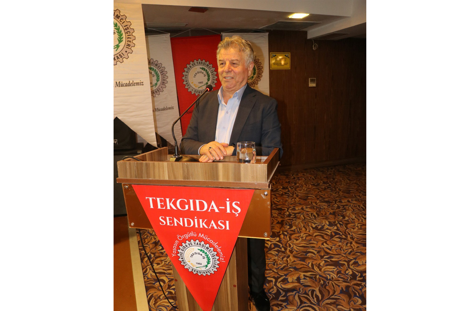 Genel Başkanımız Mustafa Türkel, Tekgıda-İş olarak 2010’dan sonra sendikanın kendisini gözden geçirerek yeni politikalar belirlediğini belirterek, sözlerine şöyle devam etti: “Sendikamız, özellikle 2010’dan sonra özel sektörle olan ilişkilerini yeniden konumlandırmış, kendi pozisyonunu yeniden gözden geçirmiş, Türkiye işçi sınıfının geleceğini yeniden analiz etmiş, yaşadığı TEKEL, ÇAYKUR ve 90’lardan bu tarafa gelen mücadele geleneklerini yeniden analiz etmiş, kendini yeniden ihtiyaçlara göre belirlemiş konumlandırmış, ideolojisini oluşturmuş. Sendikayı yeniden mücadele alanı içerisine sokmuş, sınıf mücadelesi içerisinde başat mücadele edecek bir neslin kuşağıyız. Yıllardır süren bir mücadeleyle bu noktadayız. Sendika olarak Türkiye’nin en demokratik, en şeffaf, en mücadele sendikalardan birini yarattık, hepinize teşekkür ediyorum. Biz özel sektörde son yıllarda çok büyük gelişmeler göstermiş, özel sektör toplu sözleşmelerinde doğrudan çalışanlarımızla ilişkiler kurarak, onları anlayarak, bir taraftan da mücadele ederek, örgütlü gücümüzü geliştirerek ama aynı zamanda örgütlenme nedeniyle işten atılan arkadaşlarımıza, bütün kaynaklarımızı, bütün imkanlarımızı zorlayarak onların evinin elektriğinin kesilmesine, çocuğunun susuz kalmasına izin vermeyecek sürekli ve devamlı gelir desteği sağlayacak bir sendikal politika geliştirmişiz. Sendikal nedenle işten atılan her arkadaşımıza, davalarını kazanana kadar geçen süreçlerde mümkün olduğu kadar ekonomik destek vererek, kendi kaynaklarımızı zorlayarak imkân sağlar hale gelmişiz.”