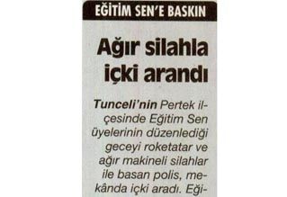 Tunceli’nin Pertek ilçesinde EĞİTİM Sen üyelerinin düzenlediği geceyi roketatar ve ağır makineli silahlar ile basan polis, mekânda içki aradı. EĞİTİM-Sen yetkilileri konuyla ilgili suç duyurusunda bulunmaya hazırlanıyor. Konuyla ilgili basın toplantısı düzenleyen EĞİTİM Sen Tunceli Şube Yöneticisi Haydar Çetinkaya, "Pertek’te sendikanın kuruluş yıldönümü nedeniyle üyelerimiz yemek vermişti. Geceye Pertek Belediye Başkanı Kenan Çetin de katıldı.
