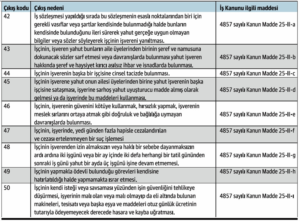 Yeni düzenlemeye göre İş Kanunu’nun 25’inci maddesinin ikinci fıkrasına göre yapılacak fesih bildirimlerine ait işten çıkış kodları aşağıdaki gibi kullanılacaktır.