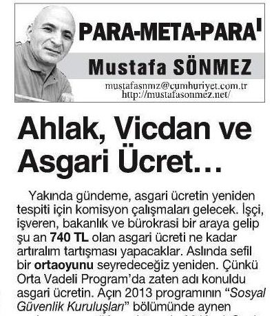 Açın 2013 programının "Sosyal Güvenlik Kuruluşları" bölümünde aynen şunlar yazıyor: "Asgari ücretin 2013 yılı Ocak ve Temmuz aylarında yüzde 3 oranında… artırılması öngörülmüştür." Çok açık değil mi? AKP rejimi, yukarıdan dayatıyor kararları, sonra da demokrasicilik oynuyor. Milyonları ilgilendiren asgari ücrette de öyle. .