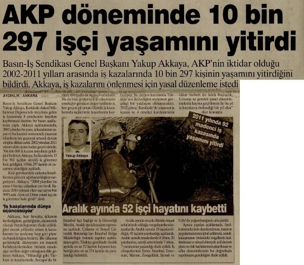 Basın-İş Sendikası Genel Başkanı Yakup Akkaya, AKP´nin iktidar olduğu 2002-2011 yılları arasında iş kazalarında 10 bin 297 kişinin yaşamını yitirdiğini bildirdi. Akkaya, iş kazalarını önlenmesi için yasal düzenleme istedi.