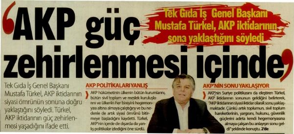 Tekgıda İş Genel Başkanı Mustafa Türkel, Türkiye’nin sahip olduğu enerjisini kendisi ve kendi halkı için harcaması gerekirken başka yerlere harcadığını belirterek, "Türkiye’nin Suriye ile ilgili sergilediği tavırdan sendika olarak son derece rahatsızız. Türkiye kendi iç huzurunu sağlaması, kendi enerjisini kendi insanı için harcaması gerekirken, hiç anlam ve amacı olmayan bir savaşın içine sokulmak istemesine de her zaman karşı çıkıyoruz. Çünkü artık toplumun, sivil toplum hareketlerinin, yargısını, hukukunu, eüvenlik eüclerini adeta kendi hegemonyasına almaya çalışan bu anlayışın sonu geldi. Çünkü artık güç zehirlenmesi içerisindedir" dedi.
