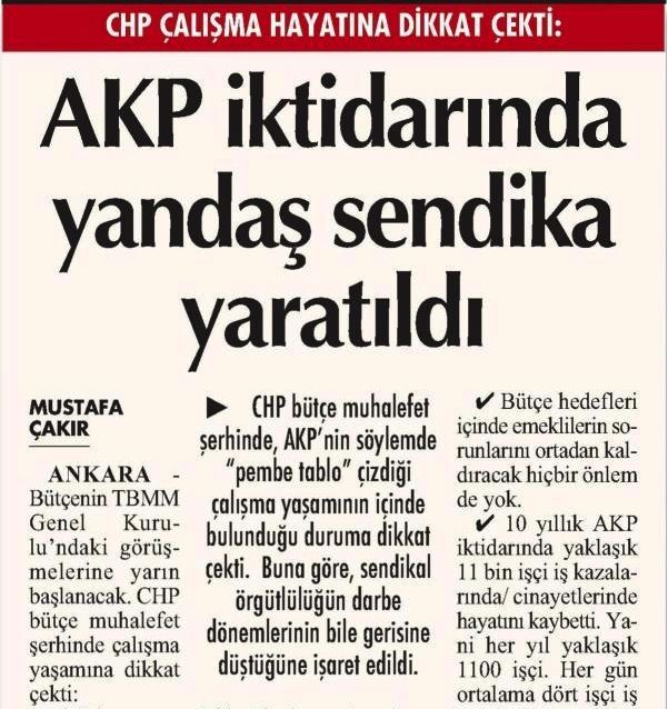 CHP bütçe muhalefet şerhinde, AKP´nin söylemde pembe tablo çizdiği çalışma yaşamının içinde bulunduğu duruma dikkat çekti. Buna göre, sendikal örgütlülüğün darbe dönemlerinin bile gerisine düştüğüne işaret edildi.