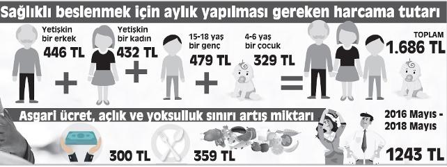 Mayıs 2018 dönemi için açlık ve yoksulluk sınırı verilerine göre dört kişilik bir ailenin sağlıklı bir biçimde beslenebilmesi için, günlük 56.21 TL, aylık 1.686 TL’lik harcama yapması gerekiyor.