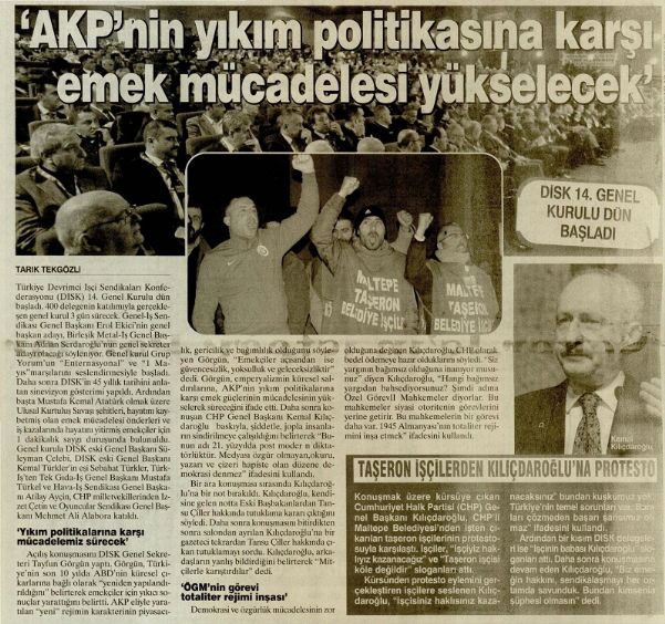 Görgün, emperyalizmin küresel saldırılarına, AKP’nin yıkım politikalarına karşı emek güçlerinin mücadelesinin yükselerek süreceğini ifade etti. Daha sonra konuşan CHP Genel Başkanı Kemal Kılıçdaroğlu baskıyla, şiddetle, jopla insanların sindirilmeye çalışıldığını belirterek, "Bunun adı 21. yüzyılda post modern diktatörlüktür. Medyası özgür olmayan,okuru, yazarı ve çizeri hapiste olan düzene demokrasi denmez" ifadesini kullandı.