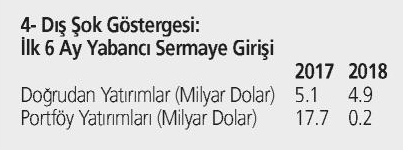 Türkiye’ye döviz girişinde portföy yatırımlarında şok bir gerileme olmuştur. 2017 ilk 6 ayında 17.7 milyar dolar olan Portföy yatırımları net girişi 2018 yılının aynı döneminde 0.2 milyar dolara düşmüş ve dolayısıyla döviz arzı daralmıştır.
