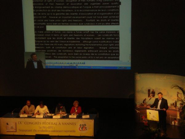 Fransa Gıda ve Tarım Sendikası FGA-CFDT’nin Vannes’da düzenlenen Kongresine davet edilen sendikamız adına Genel Başkanımız Mustafa Türkel Kongre’nin 2. gününde konuşma yapmış ve Türkiye’nin AB üyelik süreci ile sendikalar arası dayanışmanın önemine vurgu yaparak Fransa sendikasının Türkiye’nin AB üyeliğine destek veren kararına teşekkür etmiştir. (Konuşma metnine ekte ulaşabilirsiniz)