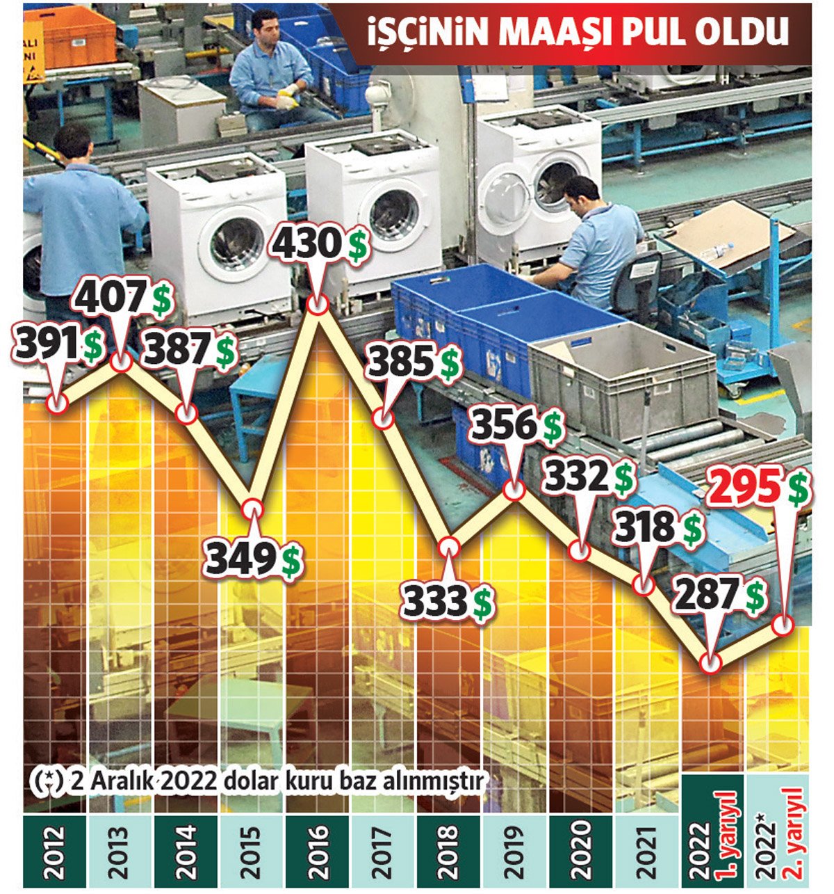 Asgari ücretli 10 yıl önceye göre 96 dolar daha az ücret alıyor. 10 yıl önce 391 dolar seviyesinde olan asgari ücret, günümüzde 5 bin 500 TL 35 kuruş karşılığı 295 dolar seviyesinde.