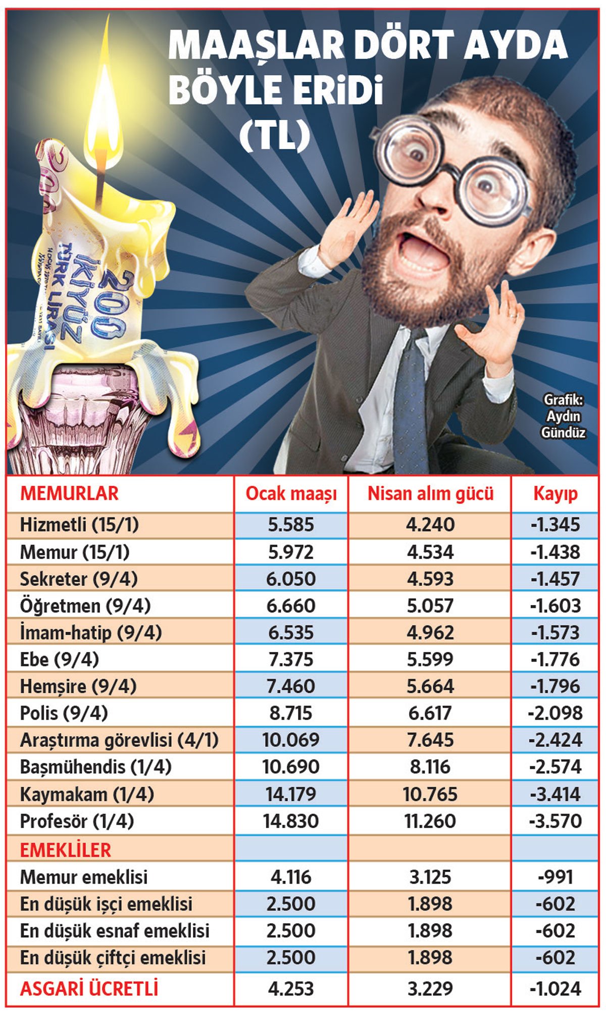 Memur ve memur emeklilerine yılbaşında yüzde 5’i toplu sözleşme yüzde 2.5’i ek zam olmak üzere toplam yüzde 7.5 zam yapılmıştı. Ancak 4 ayın sonunda enflasyon yüzde 31.71’e çıktı. Memur ve emeklinin hükümetten yüzde 24.21 oranında enflasyon farkı alacağı oluştu. Ancak oluşan farklar temmuz ayına kadar ödenmeyecek. Yeni yıla 5 bin 972 lira maaşla giren en düşük dereceli memurun alım gücü 4 bin 534 liraya düştü, memur bin 438 lira kaybetti. Aynı dönemde öğretmen bin 603 lira, profesör 3 bin 570 lira, hemşire bin 796 lira alım gücü kaybına uğradı. 4 ayda en düşük memur emeklisinin aylığında 991 lira erime yaşandı.