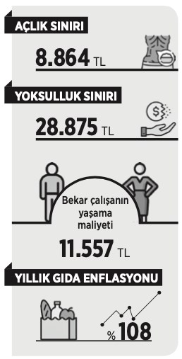 Bir ailenin aylık kira, ulaşım, fatura, eğitim, sağlık, giyim gibi tüm harcamalarını kapsayan yoksulluk sınırı ise, ocakta 28 bin 875 TL’ye yükseldi. Türk-İş, bekar bir çalışanın toplam yaşama maliyetinin ise 11 bin 557 TL’ye çıktığını açıkladı.