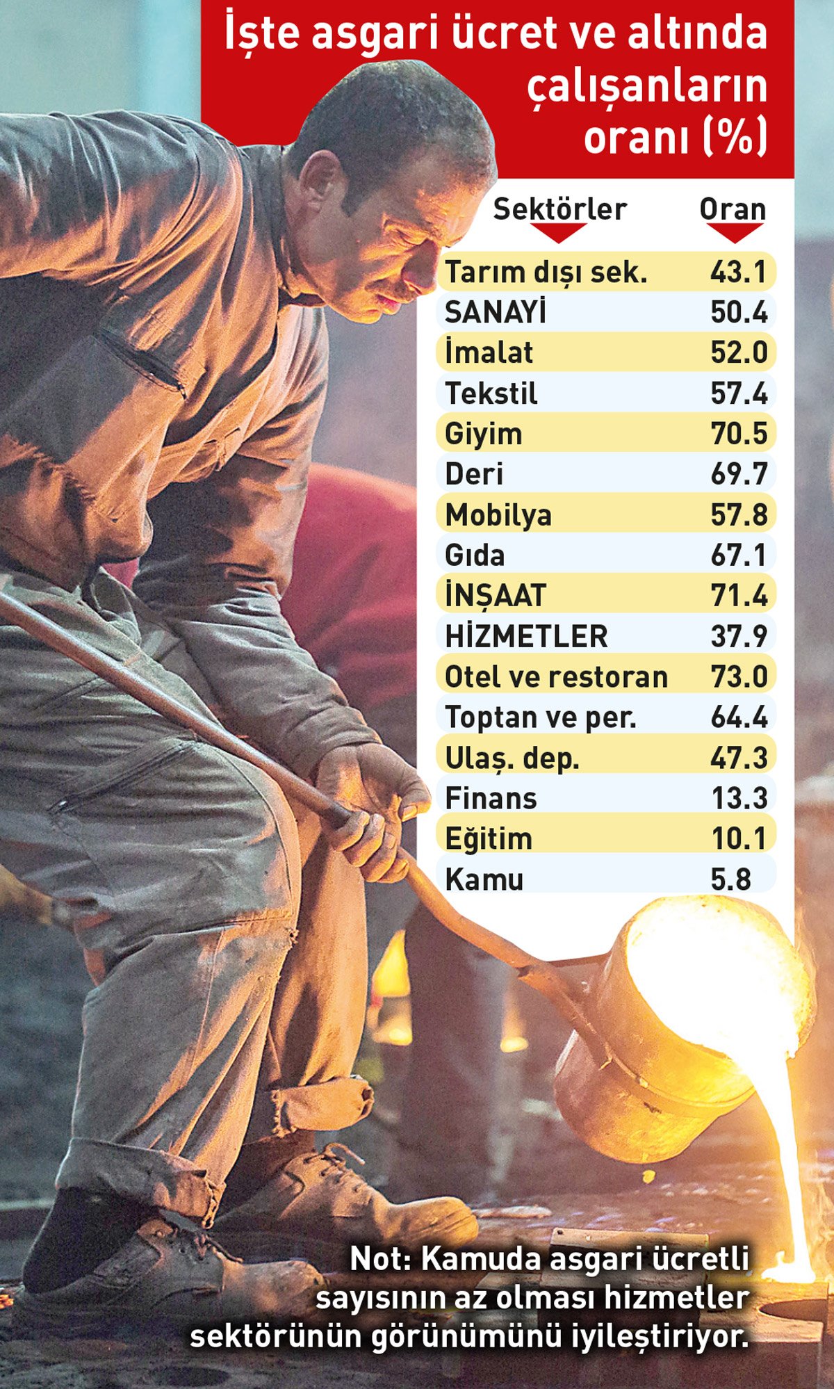 Merkez Bankası’nın analizine göre, ülkede tarım dışı sektörlerde çalışan ücretlilerin yüzde 43.1’ni oluşturan yaklaşık 7 milyon kişi, asgari ücretli ve altı çalışan işçilerden oluşuyor. Bu oran sanayide yüzde 50.4, inşaatta yüzde 71.4, hizmetlerde yüzde 37.9 olarak hesapladı. Merkez Bankası, hizmetlerde oranın düşük çıkmasının, asgari ücretli oranın çok düşük olduğu kamu sektörünün de bu sektör içinde değerlendirilmesinden kaynaklandığını aktardı.
