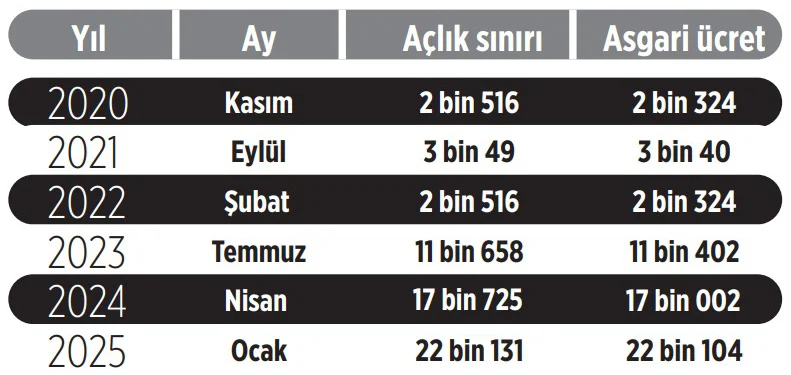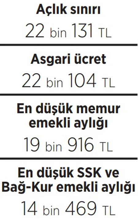 Resmi enflasyon oranının altında zamlanan asgari ücret cebe girmeden sofralar daha da daraldı. Açlık sınırı 22 bin 131 liraya çıkarak yeni asgari ücreti ilk aydan geçti.