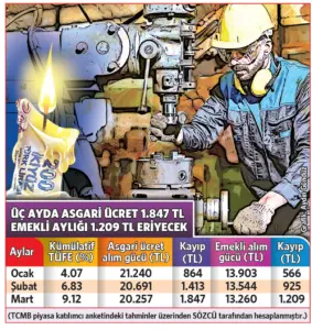 Enflasyonun tahminler civarında gerçekleşmesi halinde, 14 bin 469 liraya çıkarılan en düşük emekli aylığına yapılacak 1.969 liralık zammın büyük bölümü ilk 3 ayda buhar olacak.