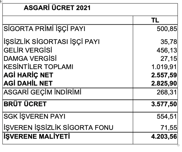 2021 yılı evli olmayan ve çocuksuz bir kişini asgari ücreti brüt 3.577,50 TL, Asgari Geçim İndirimi (AGİ) dahil net 2.825,90 TL olarak belirlendi. 500 lira artırıldı.