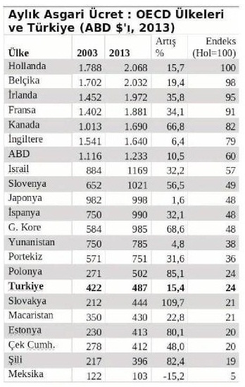 Yine OECD verilerine göre, Türkiye’de asgari ücretin dolar karşılığı AKP iktidarında ancak yüzde 15 arttı ve 2003 ‘te 422 dolar ilçen 2013’te 487 dolar olarak gerçekleşti. Oysa aynı dönemde dolar olarak kişi başına gelir 4 bin 560 dolardan 10 bin 800 dolara çıkarak yüzde 135’in üstünde artış gösterdi. Bu da AKP dönemindeki büyümeden ücretli sınıfın yeterli pay alamadığını ortaya koyuyor. Türkiye’de dolar olarak kişi başına gelir AKP döneminde yüzde 135 artmış görünürken asgari ücret artışı yüzde 15’te kaldı. Ücretliler büyümeden pay alamadı