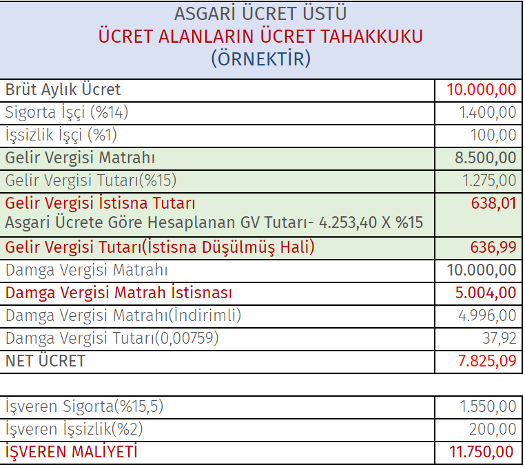 Resmî Gazete ’de yayınlanan Kanun hükümlerine göre, aylık 10.000,00 TL brüt ücret alan bir çalışanın örnek ücret tahakkuku aşağıda paylaşılmıştır.