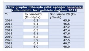 2- Yüzde paylara göre; 2014-2022 yılları arasında halkın en düşük geliri alan ilk yüzde 20’sinin, toplam gelirden aldığı pay, yüzde 6,2’den yüzde 6’ya gerilemiş; buna mukabil en yüksek geliri alan beşinci yüzde 20’sinin payı ise yüzde 45,9’dan yüzde 48,0 yükselmiştir. Buna orta gelir tuzağı denilir. (Aşağıdaki tablo.)