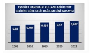 TÜİK verilerine göre; 2005 yılında Gini Katsayısı 0,380 idi. Bu katsayı giderek büyüdü ve 2022 yılında 0,487 oldu. (Aşağıdaki grafik) Bu demektir ki AKP iktidarı döneminde gelir dağılımı aşırı bozuldu.